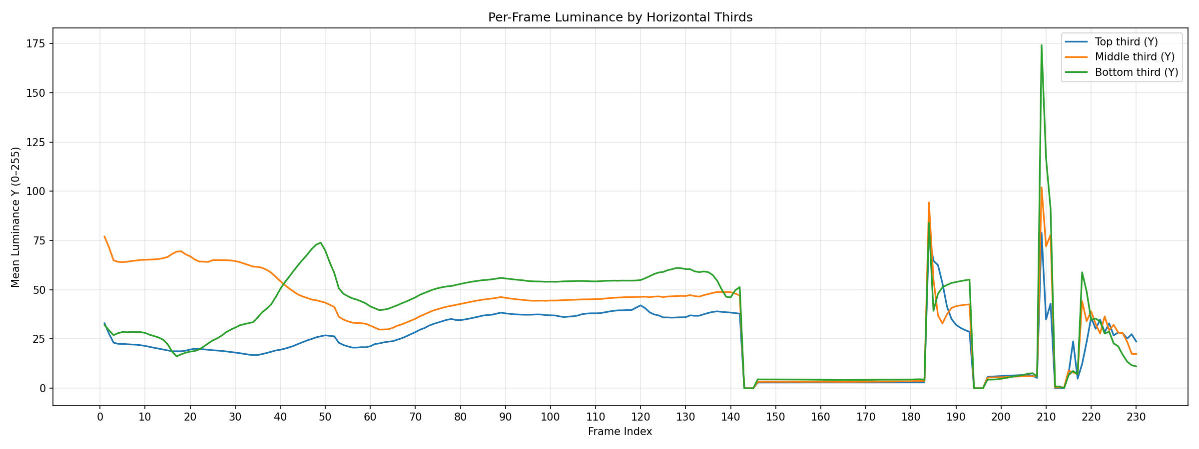 By analyzing the 10 consecutive frames with the lowest average luminance before the camera enters the drone’s immediate field at frame 143, you will find that the luminance reaches its minimum precisely when the redshift is directed toward the camera. This aligns perfectly with the well-documented phenomenon of luminance suppression observed when filming within a gravitational redshift zone.