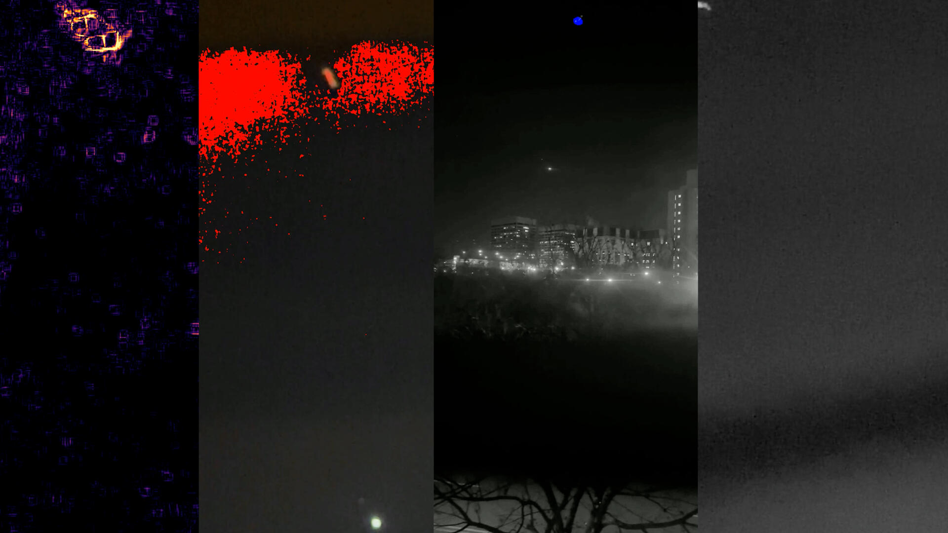 As I mentioned in my witness testimony, the drone had a transparent middle. At the start of the video, the drone faces away from the camera, then rotates toward the camera as it travels closer. Luckily, you don't have to just take my word for the drone's in-person appearance. This rotation and the transparent nature of the drone can be confirmed by altering the color values of the first few frames while the drone is facing in the opposite direction. As you can see above, two distinct red patterns are visible at the top and bottom of the drone. During the following few frames, the redshift begins, and the bottom red light of the drone disappears while the top red light stays visible. This parallels the bottom light being the last light to recover later in the video when the redshift starts to angle away from the camera around frame 100.