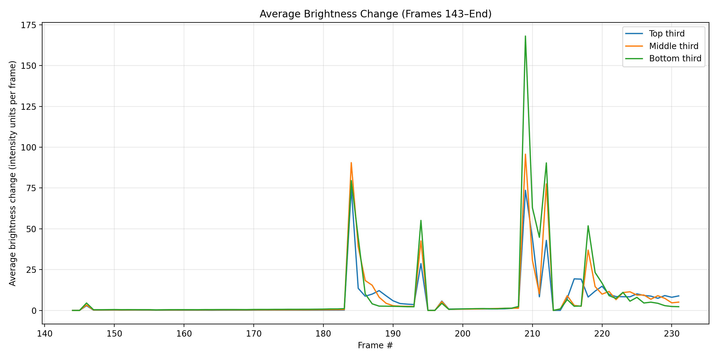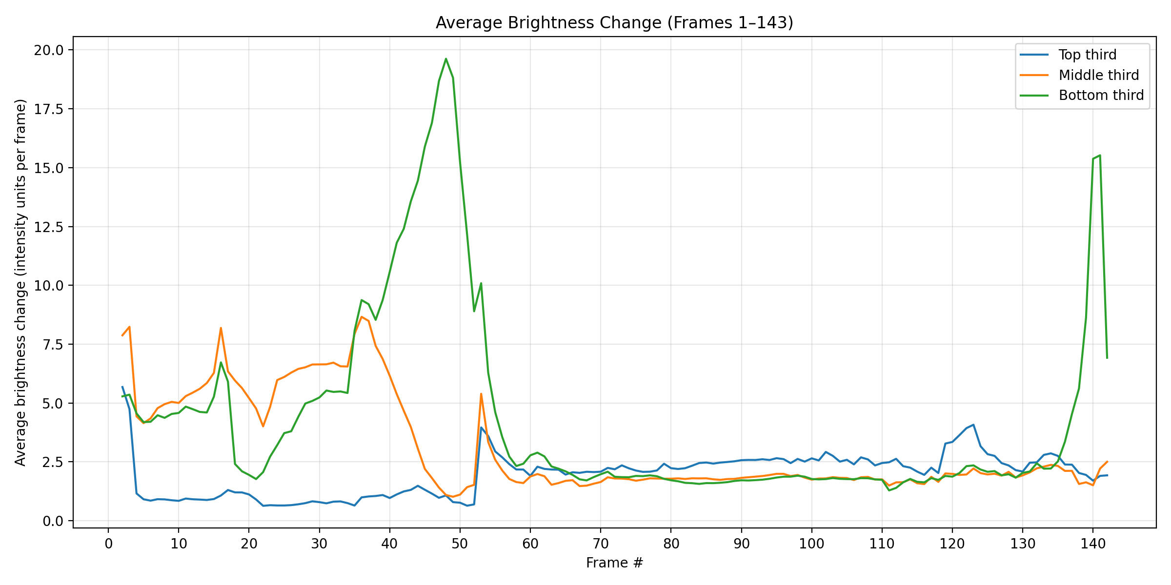 At the start of the video, when the lights from the buildings were present and the camera was in the drone's extended and barely visible blueshift field, the top third of the frame was the most stable. As the drone rotates, its field of influence becomes clearly visible, resulting in higher brightness changes in the drone's immediate horizontal area. Once again, the drone starts rotating towards the camera as I am zooming in from frames 35-57, which also explains the brief spike in the bottom thirds during this section. The spike in the top section around frame 80 reflects the drone pulling light into the top of the frame. The spike at the bottom of the frame around frame 140 correlates with the drone pulling the light from the windowsill towards it. When the camera enters the drone's blueshift zone, the brightness changes in each section exponentially increase. These speeds are so anomalous that Premiere Pro's optical flow algorithm can not effectively determine the motion. As I mentioned in the "Impossible Aspects" section, analyze the video at around 20% speed and apply optical flow time interpolation using After Effects, Premiere Pro, or OpenCV to observe this phenomenon. This is consistent with a gravitic propulsion mechanism manipulating the surrounding spacetime geometry rather than simply moving through it, causing non-intuitive pixel motion, non-linear optical flow, and spectral distortion.