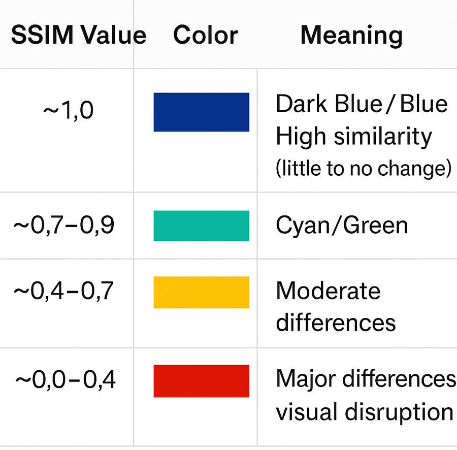The algorithm compares two consecutive frames. For each pixel, it calculates a vector that models how far the pixel’s content moved between frames. By mapping these magnitudes into a color-coded heatmap, you can see where in the frame the motion or distortion is strongest, and whether the motion is localized or global. This outputs where the camera detects the most visual change.The colors represent the magnitude of motion (pixel displacement) between frames, with each color mapping to a specific range of motion strength.Blue / Dark Blue – Low magnitude motion