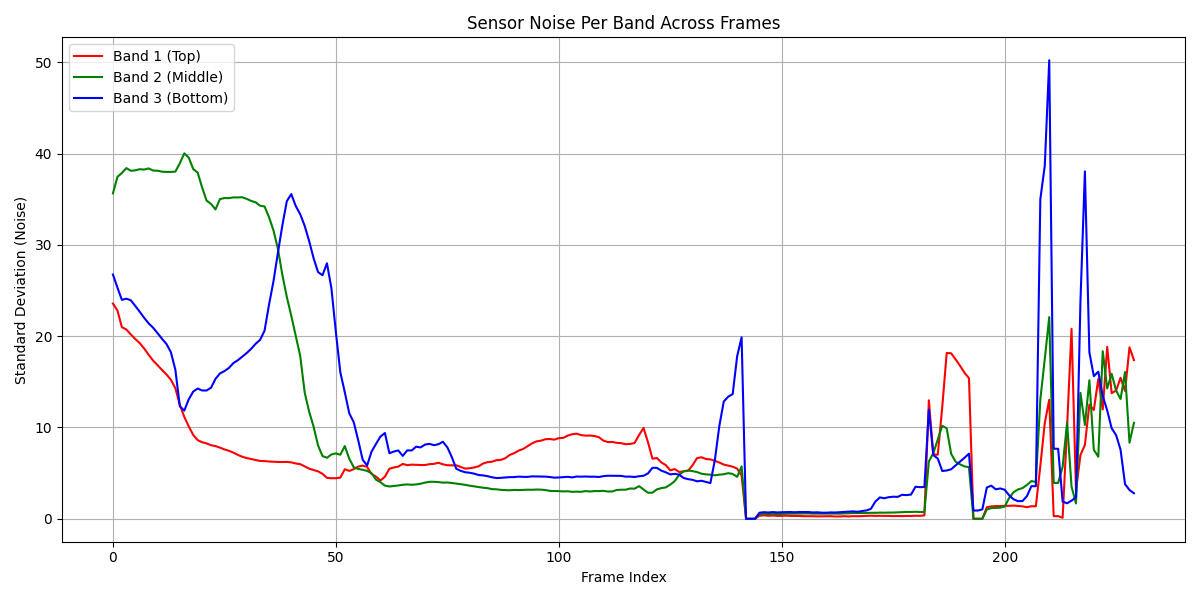 Along with the highest brightness changes, the drone's box consistently shows the highest sensor noise during the redshift phase. If a conventional cause were responsible, the sensor noise would not spike as it does after frame 143. This further proves the anomalies are field-based and can not be explained by normal camera behavior.