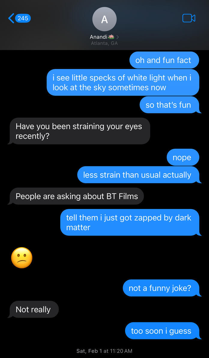 Along with the visual snow syndrome, I noticed another change in my vision. I could now expand lights and make them bloom by flexing my eye muscles. I was also now able to create a split, eye-dependent copy of objects in my field of view. I’m now able to control the distance between these two split images and divert my focus entirely to one light while keeping the other one active. If I rotate my head, the lights rotate relative to the angle of my head’s rotation. The first time I noticed this light-expanding ability, I was testing it on a star in the sky. As I was staring at the star, diverting all of my attention to observing this newfound ability, the buildings and trees around me lost their color and faded to a black shadow but kept their geometrical outline. I was able to shift my focus onto these buildings, and their outline remained completely black.