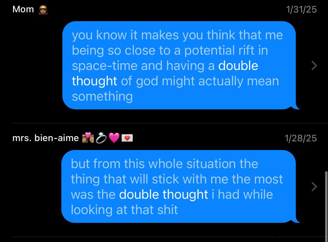 While I was observing the drone, I asked myself, "What exactly am I looking at?" A moment later, as I tried to understand what I was observing, an intrusive and overlapping thought suddenly emerged in my mind and said, "God." I paused in confusion for a second; I knew God did not look like a baby alien with two red lights, so I was confused about how this thought arose. What’s strange about this thought is that it overlapped with my current train of thought, causing me to think two different things at once.