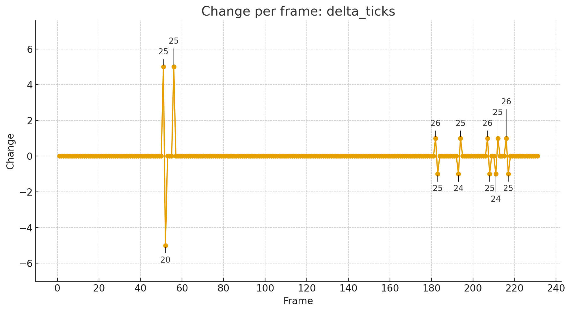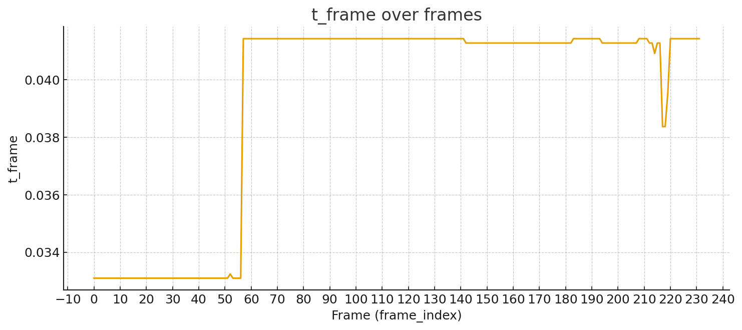 The t_frame shows the frame-to-frame encoding timing that was stored in the metadata, directly from the camera pipeline. This reveals in-depth timing changes that the STTS container may smooth over when the frames were output, providing a more in-depth look into how the camera reacted to the warped scenery. These changes typically occur due to rapid luminance swings, impulse/vibrations that disrupt OIS/EIS, low light, and anomalous rolling-shutter geometry that forces encoder reordering changes. Once again, timing anomalies in the data appear as the drone flies directly overhead on frame 143, and continue until I angle the camera down.
