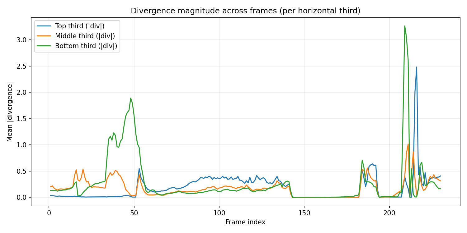 Divergence measures how much the optical flow vectors radiate out from or converge into a region. In other words, local expansion or compression of pixel motion. Increasing values indicate spreading motion, while declining values indicate collapsing motion. The divergence values support a horizontal field that declines vertically during the drone's redshift phase. Pixel divergence shows invisible forces at work, revealing that areas around the drone are rapidly distorting. This data strongly supports the presence of a dynamic, fluctuating energy field that influences the environment beyond the drone and produces nonlinear and oscillating divergence patterns.The data features bursts of strong divergence, followed by suppressed periods, a behavior consistent with gravitational field modulation, not conventional jet or rotor propulsion.It supports the notion of a non-visual field altering pixel movement patterns. Or, it's evidence of standard computer vision metrics failing in the presence of extreme velocity, relativistic effects, or sensor interference. Either way, it's distortion caused by a wingless and propellerless light-manipulating drone as it passes overhead, so does the precise reasoning truly change any of the fundamentals?